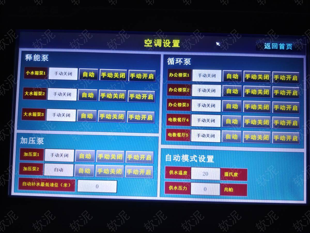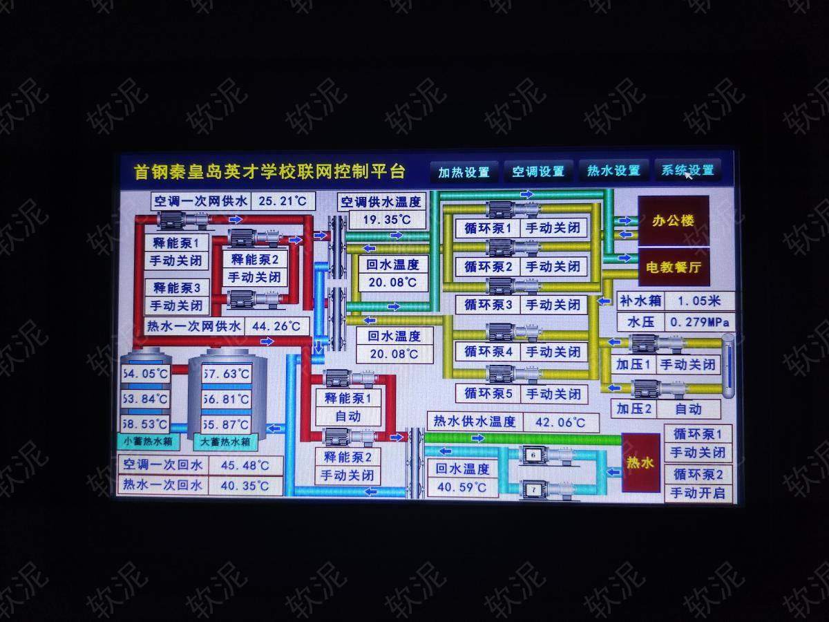 1.供暖系統(tǒng),夜間谷電價(jià)期間啟動加熱管給大水箱蓄熱,水溫提升至90攝氏度左右,二次網(wǎng)循環(huán)泵在供暖期間不間斷運(yùn)行,一次網(wǎng)循環(huán)泵間歇運(yùn)行釋放能量,維持二次網(wǎng)環(huán)境恒溫。 2.中央空調(diào)制冷系統(tǒng),直接對二次網(wǎng)降溫。 3.為了應(yīng)對學(xué)生集中用水的情況,自來水加壓泵根據(jù)水壓反饋,能夠快速提升運(yùn)行頻率,變頻恒壓。 |